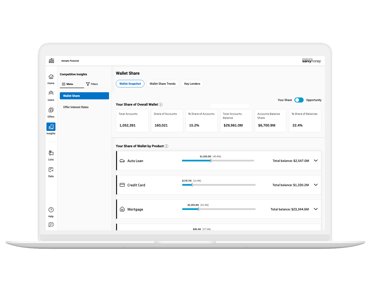 Gain visibility into wallet share, external borrowing, and market trends to compete more effectively and capture more business.