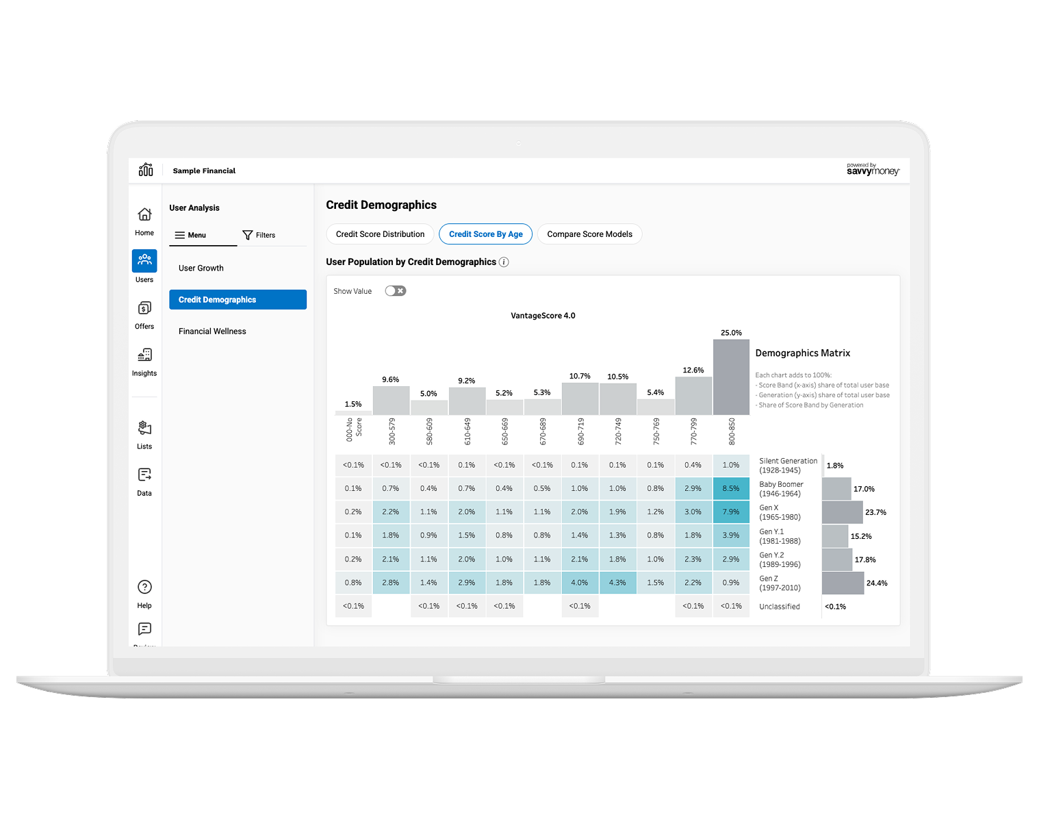 SavvyMoney Analytics provides a unified view of consumer behavior, offer performance, and competitive activity so financial institutions can identify opportunities and take action with confidence.